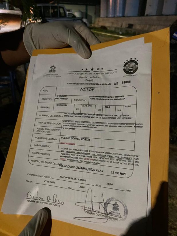 De ese modo se les dio un primer plazo para descargar el combustible hasta las tres de la tarde, pero se extendió a las 5:00PM y nuevamente hasta que lograron zarpar con un permiso retirándose a las 8:09PM la autoridades de seguridad de la isla y a las 8:30PM Talbott confirmó a Diario Roatán que el navío Nevín zarpó sin más contratiempos.
