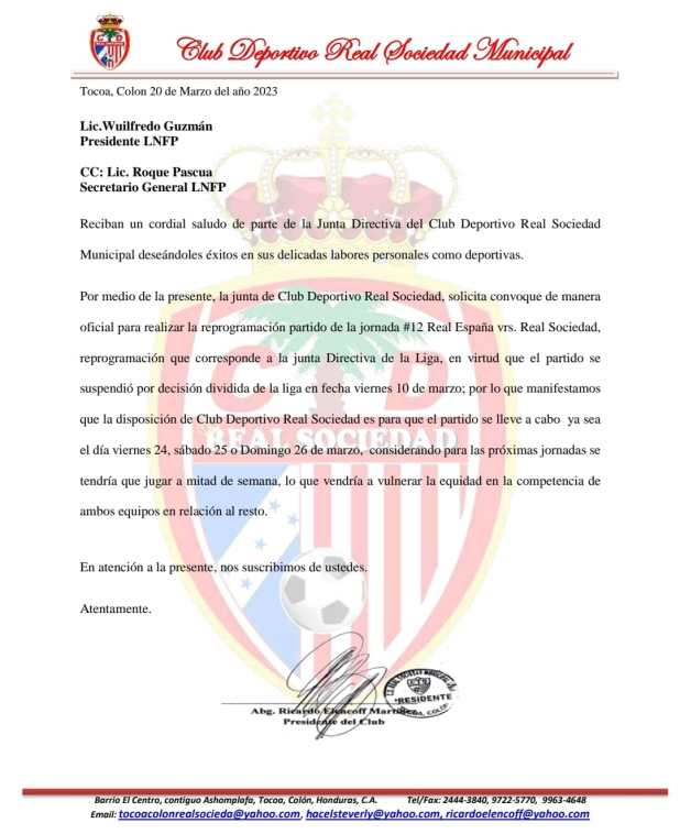 “La junta directiva del club Real Sociedad solicita que convoque de manera oficial para realizar la programación del partido de la jornada 12 ante Real España vs Real Sociedad, reprogramación que corresponde a la junta directiva de la Liga, en virtud que el partido se suspendió por decisión dividida en la fecha10 de marzo”, dice parte de la nota.