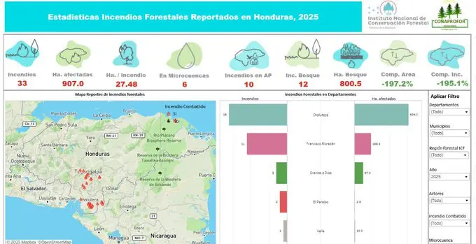 De los 33 incendios 16 se registraron en el departamento de Choluteca, 11 en Francisco Morazán, tres en Gracias a Dios, dos en El Paraíso y uno en el departamento de Valle, según las estadísticas oficiales.