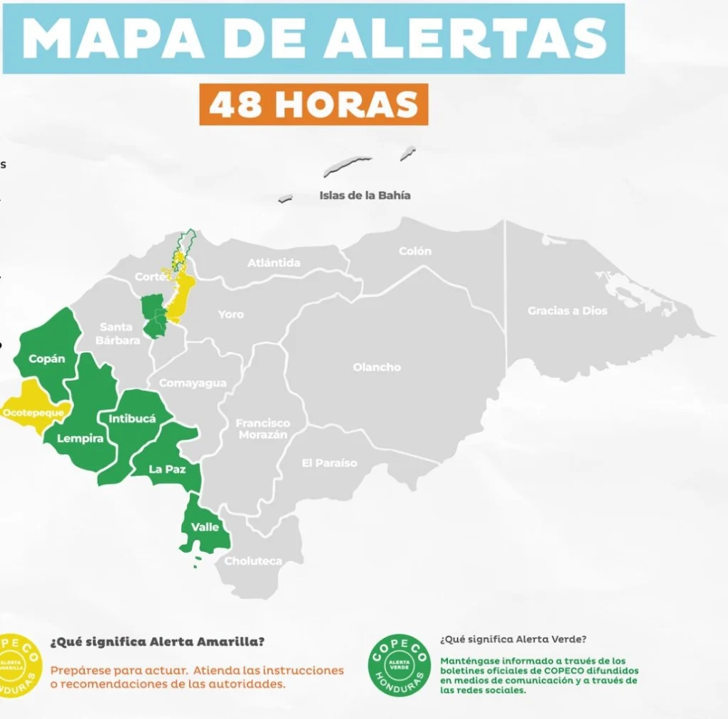 Copeco indicó además que los departamentos de Copán, Lempira, Intibucá, La Paz y Valle, permanecerán en Alerta Verde.