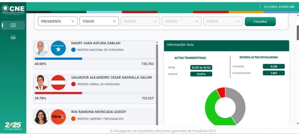 En ese primer corte, el panorama también favorecía a Asfura, quien acumulaba 597,184 votos. Le seguía Salvador Nasralla con 579,626 votos, mientras que la candidata oficialista Rixi Moncada sumaba 287,166 votos. Completan la lista Nelson Ávila (PINU-SD) con 12,046 votos y Mario Rivera (DC) con 2,450 votos.