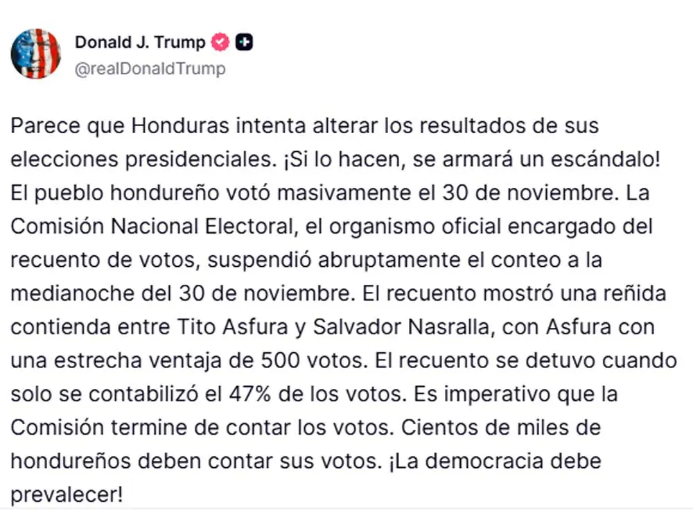 A través de Truth Social señaló que “parece que Honduras intenta alterar los resultados de sus elecciones presidenciales. ¡Si lo hacen, se armará un escándalo! El pueblo hondureño votó masivamente el 30 de noviembre”.